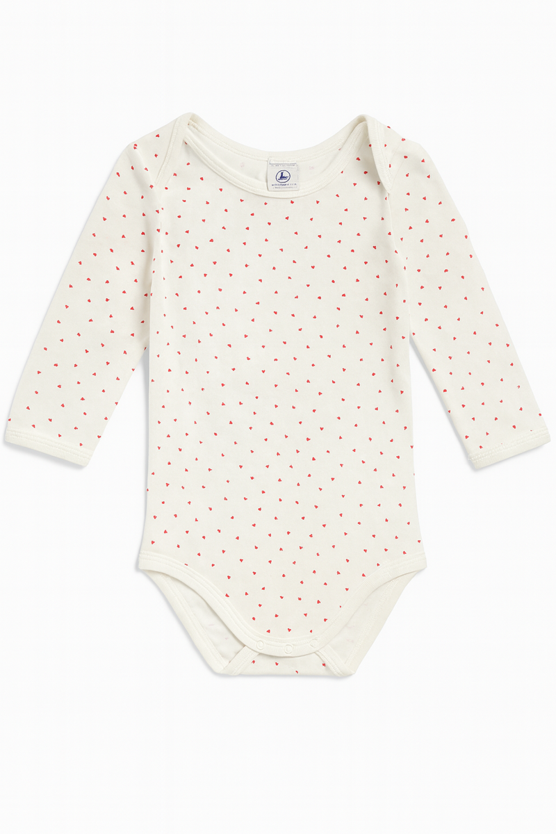 Body a maniche lunghe in morbido cotone bianco panna, decorato con una delicata fantasia di piccoli cuoricini rossi all-over. Il design con spalle sovrapposte facilita la vestizione, mentre i bottoncini a pressione sul fondo rendono il cambio rapido e pratico. Perfetto per l’uso quotidiano grazie al tessuto leggero e confortevole sulla pelle del bambino.