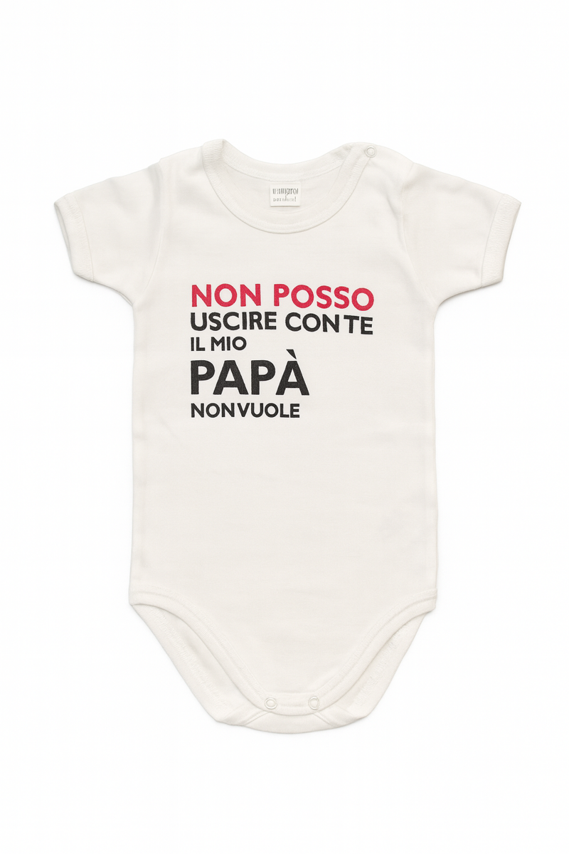 Body bianco con scritto_ Non posso uscire con te il mio papa non vuole_ in morbido cotone, pensato per offrire comfort quotidiano e una vestibilità pratica. Ideale per l'uso giornaliero, garantisce traspirabilità e libertà di movimento. Perfetto per asilo, passeggiate e routine di tutti i giorni.