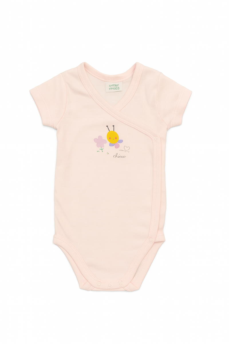 Body rosa chiaro a maniche corte con chiusura a portafoglio, pratico e comodo per la vestizione dei più piccoli. Realizzato in morbido cotone traspirante, presenta una dolce stampa con ape e fiore sul davanti. Dotato di bottoncini a pressione sul fianco e sul cavallo per un cambio semplice e veloce. Perfetto come intimo quotidiano o come pezzo unico nelle giornate più calde.