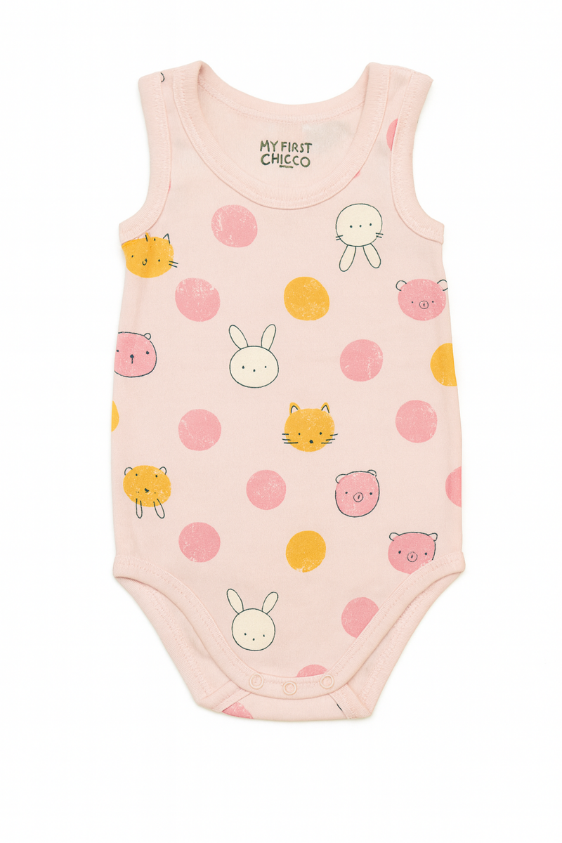 Body rosa senza maniche in morbido cotone, decorato con dolci faccine di animaletti (coniglietto, gattino e maialino) e pois colorati. Pratico e confortevole, è perfetto per le giornate più calde grazie alla leggerezza del tessuto e alla chiusura con bottoncini a pressione sul fondo. Ideale come intimo o come pezzo unico per un look estivo semplice e adorabile.