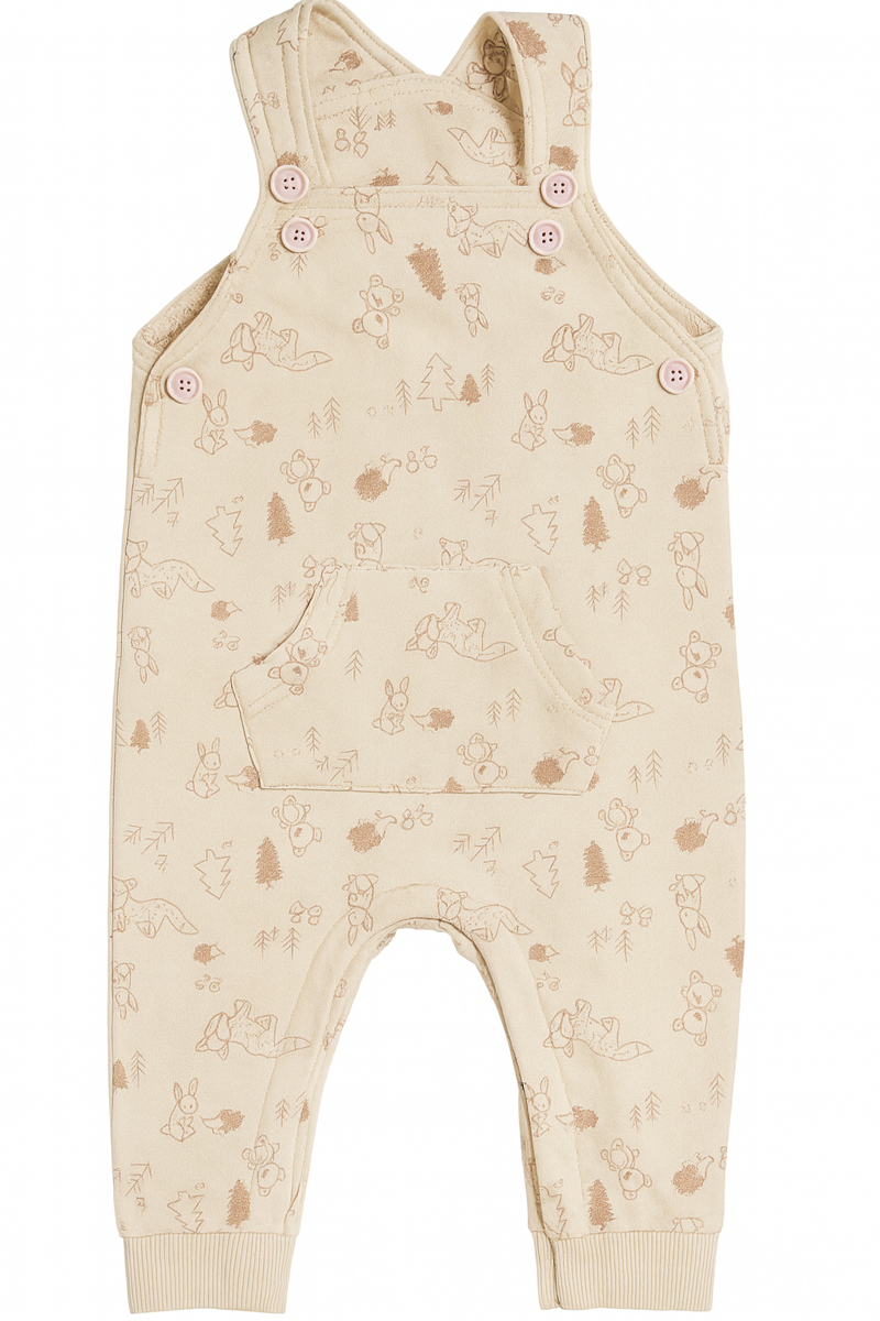 Salopette beige morbidissima con fantasia di piccoli animaletti e dettagli boschivi, completa di tasca frontale e bottoncini laterali e sulle bretelle per indossarla facilmente. Un capo comodo e versatile, perfetto da abbinare a body e maglioncini per creare outfit dolci e pratici in ogni stagione.