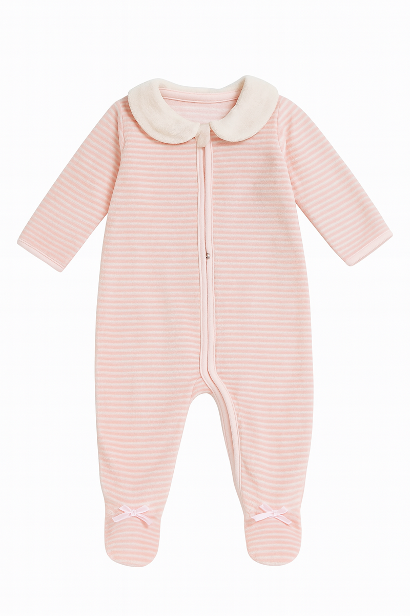 Tutina rosa a righe con colletto morbido in tinta unita e piedini chiusi, perfetta per i primi mesi grazie al tessuto soffice e confortevole. La chiusura con zip frontale rende il cambio semplice e veloce, mentre i piccoli fiocchetti sui piedini aggiungono un dettaglio dolce e delicato. Ideale per la nanna e le giornate in casa.
