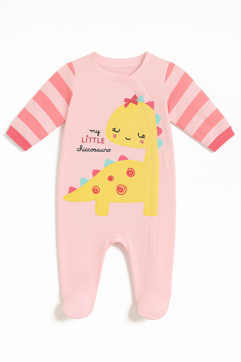 Tutina rosa con maniche a righe e grande applicazione di dinosauro giallo sul davanti, con la scritta “my little chiccosauro”. Morbida, colorata e super simpatica, è perfetta per aggiungere un tocco giocoso ai look dei primi mesi. La chiusura con bottoncini rende il cambio semplice e pratico. Un capo dolcissimo e divertente per la nanna e il tempo libero.