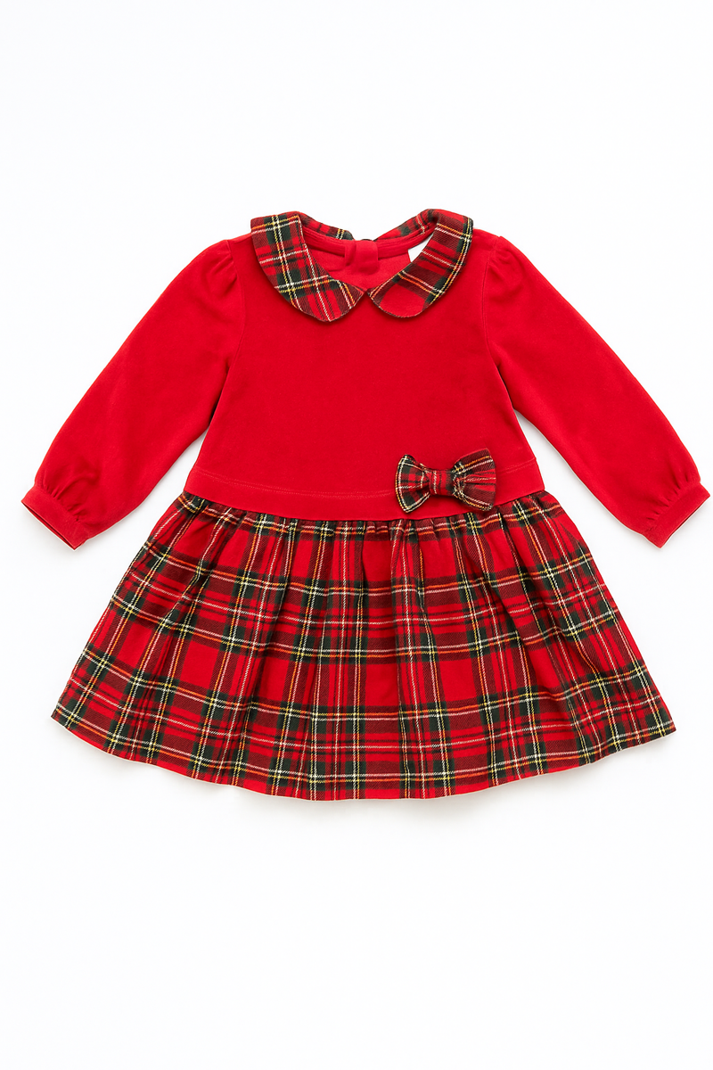 Delizioso vestito natalizio in morbido velluto rosso, impreziosito da colletto e fiocchetto in fantasia tartan. Le maniche lunghe e la gonna a pieghe in motivo scozzese lo rendono il capo ideale per le feste, comodo e allo stesso tempo elegantissimo. Perfetto per creare un look tradizionale e irresistibile durante il periodo natalizio.